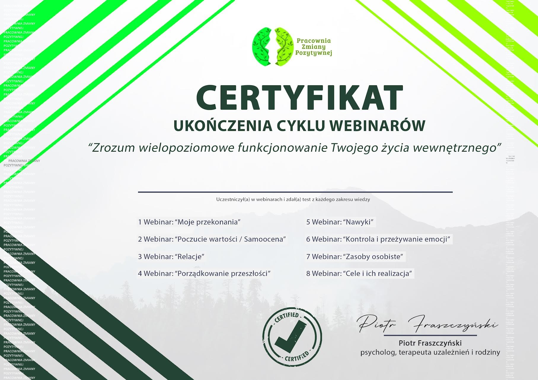 Wszystkie osoby które będą uczestniczyły w 8 webinarach, i odpowiedzą na pytania, otrzymają certyfikat uczestnictwa podpisany przez prowadzącego Piotra Fraszczyńskiego.