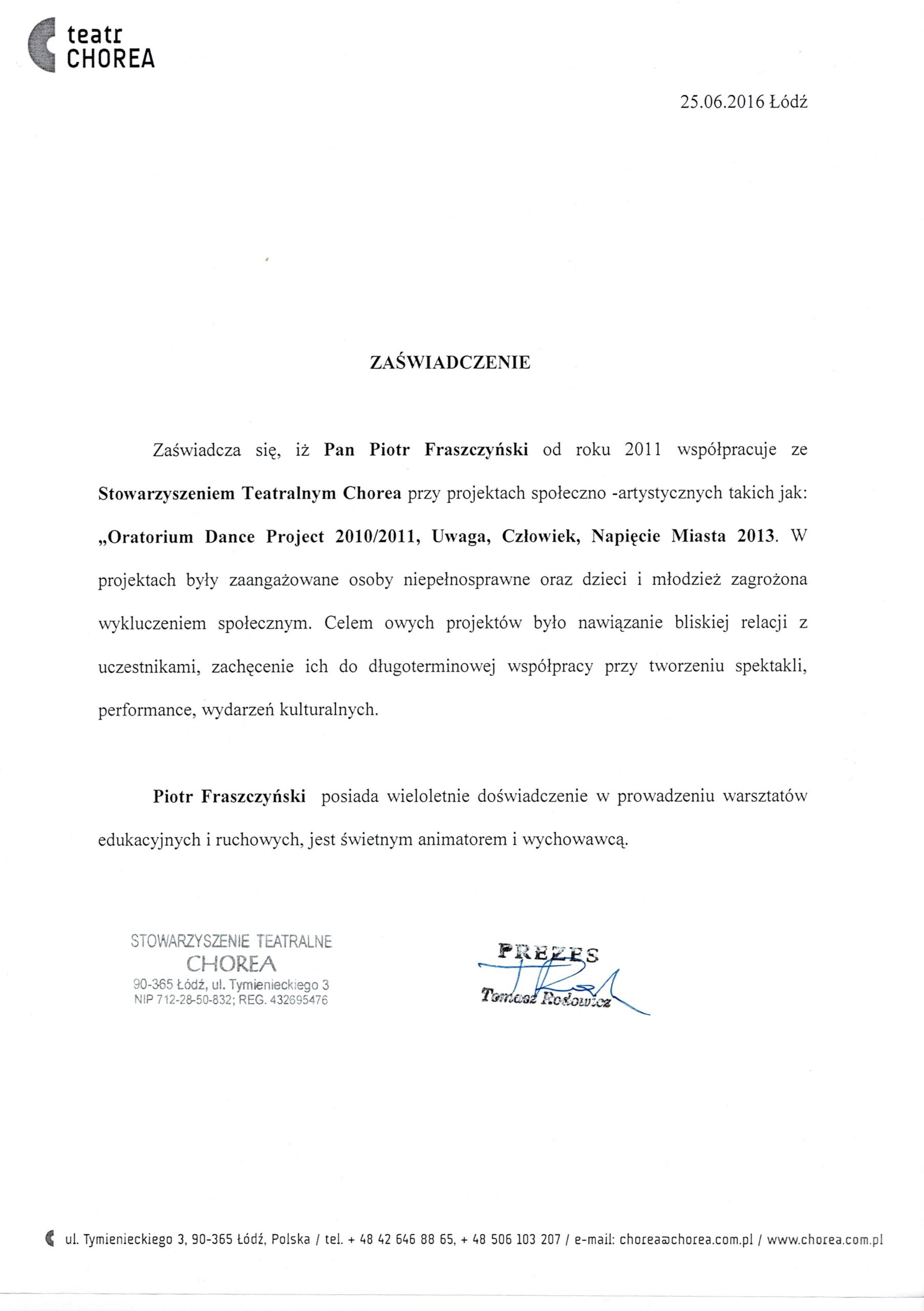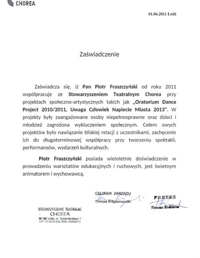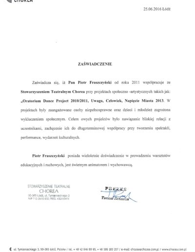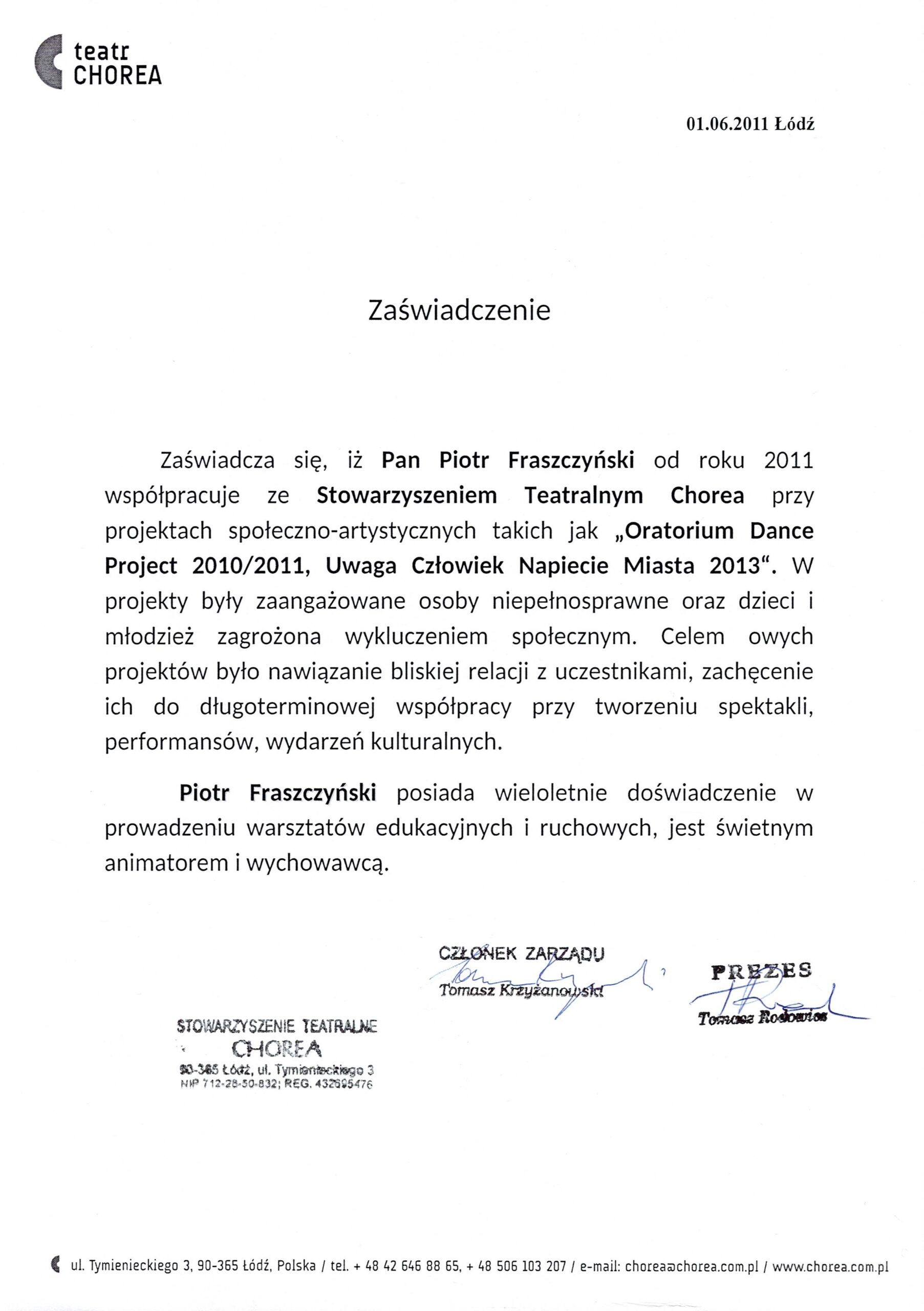 - w Teatrze Chorea przy projektach angażujących osoby zagrożone wykluczeniem społecznym